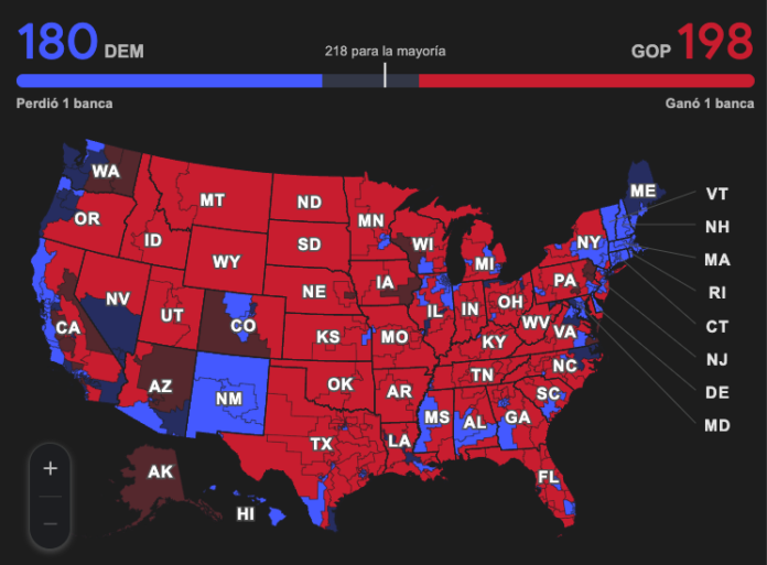 El Partido Republicano lidera en la Cámara de Representantes con 198 escaños, mientras los demócratas suman 180.