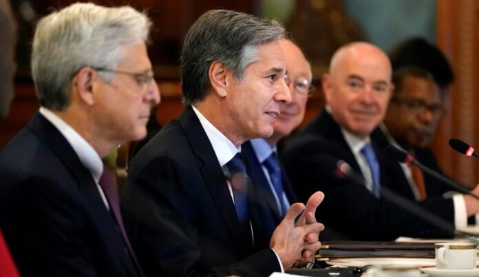 Blinken y la delegación integrada por el secretario de Seguridad Nacional, Alejandro Mayorkas y el Fiscal General, Merrick Garland, se reunieron con sus anfitriones: el presidente López Obrador y el canciller mexicano Marcelo Ebrard.