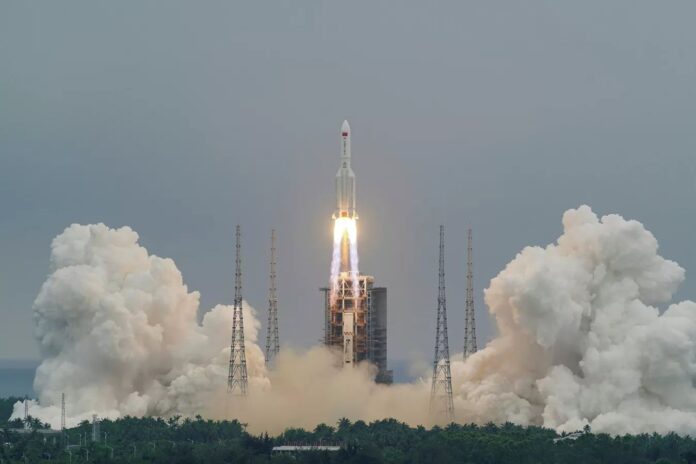 El cohete Gran Marcha 5B (Changzheng) con el módulo central de la estación orbital china fue lanzado el 29 de abril desde la base espacial china de Wenchang, en la provincia de Hainan (sur).