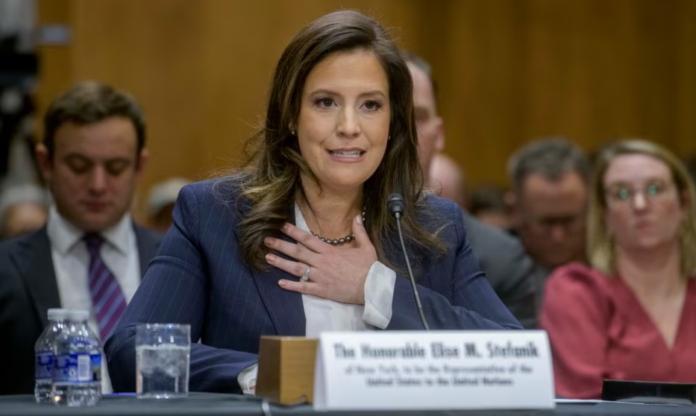 “Es imperativo asegurar un liderazgo estadounidense fuerte en las Naciones Unidas”, dijo Elise Stefanik al Comité de Relaciones Exteriores del Senado. “Comparto la visión del presidente Trump de una ONU reformada por un fuerte Estados Unidos Primero, la paz a través de la fuerza y el regreso a esta misión fundadora de promover la paz y la seguridad en todo el mundo”.