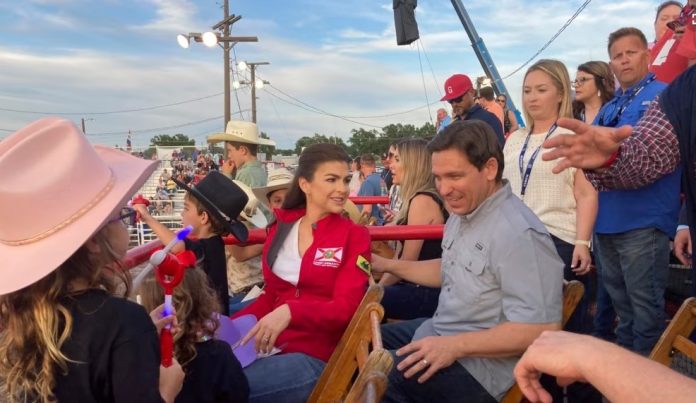 Más tarde, DeSantis se detuvo en un rodeo en Ponca, a unos 120,7 kilómetros (75 millas) al noroeste de Tulsa, y posó para fotografías con su esposa, Casey, y su hija de 3 años, Mamie, que vestía un sombrero de vaquero rosa.