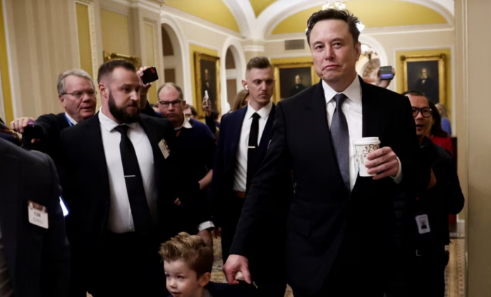 Musk, con un niño pequeño de la mano, recorrió por los pasillos del Capitolio, cerca de la cámara del Senado, rodeado de policías, periodistas y fotógrafos.