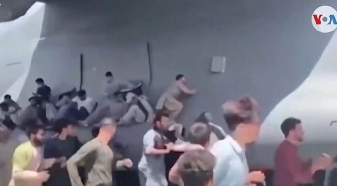 El video del aeropuerto compartido en las redes sociales mostró desorden y desesperación, incluidos algunos afganos aferrados a los costados de un avión militar estadounidense y lo que parecían ser dos personas cayendo de un avión militar estadounidense después de que despegó.