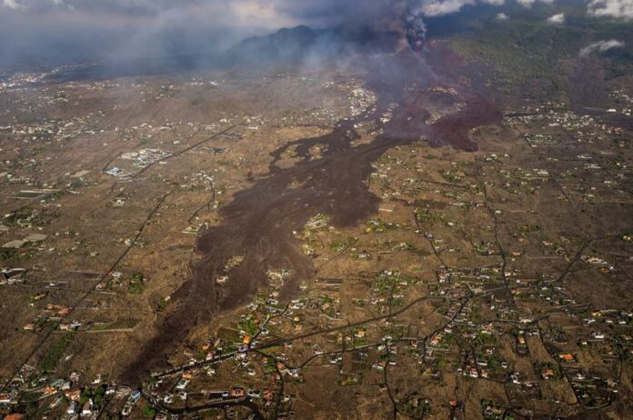 Las bocas abiertas en la sierra de Cumbre Vieja expulsan magma en grandes cantidades. Las coladas volcánicas han arrasado casi 400 viviendas y 180 hectáreas de terreno insular.