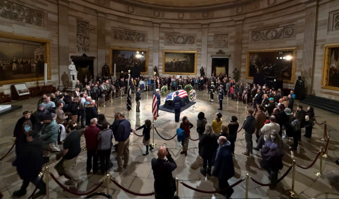 La vicepresidenta Kamala Harris y el presidente de la Cámara de Representantes, Mike Johnson, formaron parte de los tributos bipartidistas a Carter en la Rotonda del Capitolio, donde su ataúd, cubierto con la bandera estadounidense, permanece sobre el catafalco de Lincoln para que la ciudadanía pueda presentarle sus respetos.