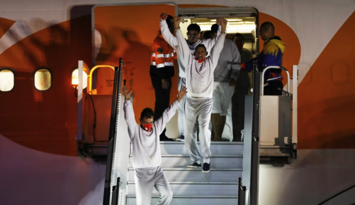 Venezuela (VOA) – Un avión de la aerolínea estatal aterrizó en Venezuela el jueves por la noche con 177 migrantes venezolanos que estaban detenidos en la base naval de Guantánamo y que fueron trasladados hasta Honduras donde fueron entregados a funcionarios del gobierno de Nicolás Maduro.