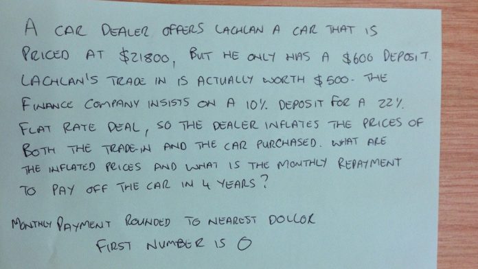 Un concesionario de autos ofrece a Lachlan un auto valuado en $21,800, pero el solo tiene $600 para el deposito inicial. Lachlan deja su auto a cambio valuado en $500. La compañia financiera insiste en un anticipo del 10% para respetar una taza del 22% fijo para cerrar el trato, así el concesionario infla en precio del auto a cambio y del auto nuevo. Cuales son los precios inflados, y cual es el pago mensual para pagar el auto en 4 años?
