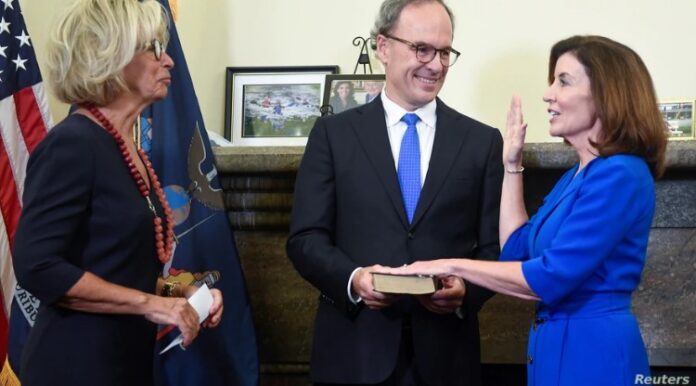 Estados Unidos (VOA/) – Kathy Hochul prestó juramento en la medianoche del martes tras convertirse en la primera mujer gobernadora de Nueva York. Reemplaza en el cargo del gobierno estatal a Andrew Cuomo, que dejó el cargo por acusaciones de acoso sexual.