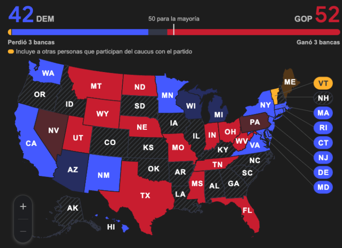 Con 52 escaños, los republicanos aseguran el control del Senado, mientras los demócratas alcanzan 42 escaños.