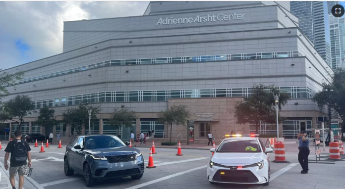 Los exteriores del Adrienne Arsht Center for the Performing Arts, el lugar donde se celebrará el encuentro de los cinco aspirantes que lograron calificar, está completamente blindado y los accesos están bloqueados.