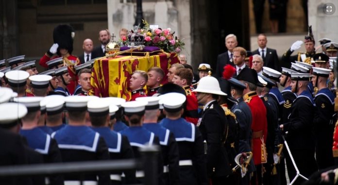 El ataúd de la reina fue transportado el lunes por la mañana a la Abadía de Westminster en el carruaje estatal de artillería de la Royal Navy, que fue arrastrado por 142 marineros. El carruaje también se usó para el funeral del padre de Isabel, el rey Jorge VI, en 1952.