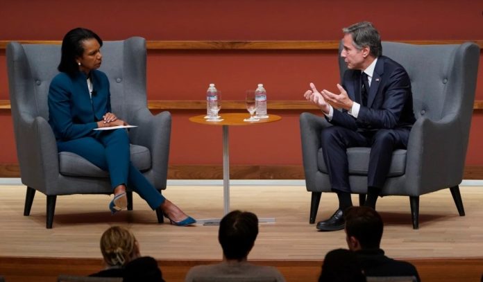“El aspecto competitivo (de la relación de EEUU con China) está en el frente y en el centro”, dijo Blinken el lunes durante una discusión con la ex secretaria de Estado Condoleezza Rice en Stanford, California.
