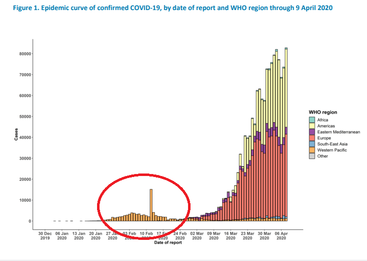 Aquí la X es convertida en un valor entre 0 y 1, donde 1 es la máxima población que puede alcanzar, en nuestro caso del coronavirus sería la población mundial o una zona específica, al graficar esta ecuación en el tiempo nos damos cuenta de que toma la forma de una parábola, crece rápidamente llega a un máximo y decae, al analizar las gráficas que publica la Organización Mundial de Salud, ¡Eureka!, el desarrollo de la pandemia en China responde al teorema de Bayes, es una parábola.