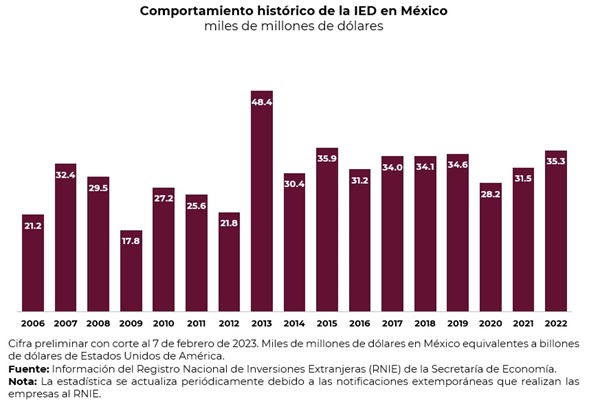 La Inversión Extranjera Directa (IED) realizada y notificada entre el 1° de enero y el 30 de junio de 2023 ascendió a 29,040.8 mil millones de dólares (mdd), lo que implicó un incremento de 5.56% respecto a la captada en el mismo lapso de 2022. Del total, el 77.85% correspondió a reinversión de utilidades, 14.80% a cuentas entre compañías, y 7.35% a nuevas inversiones, en 2022 la IED fue de 35.3 mil millones de dólares.