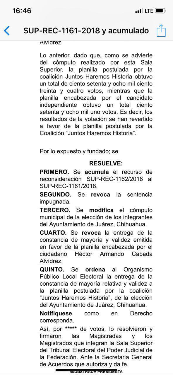 Esto es lo que dice hasta la resolución que ratifica a Cabada como triunfador.