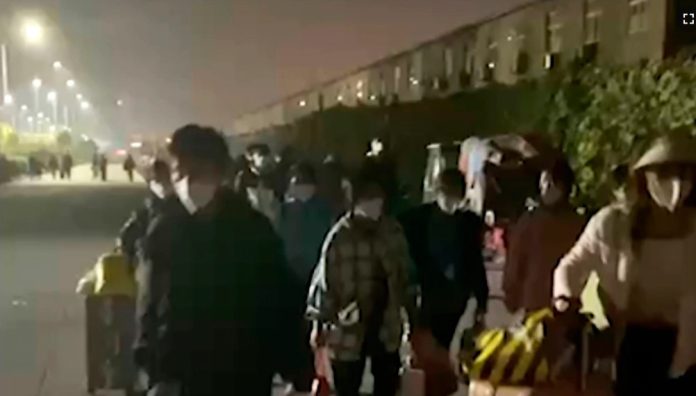 Supuestos trabajadores de Foxconn aparecían en videos que circulaban en las redes sociales chinas trepando las cercas y caminando por una carretera con sus pertenencias a cuestas.