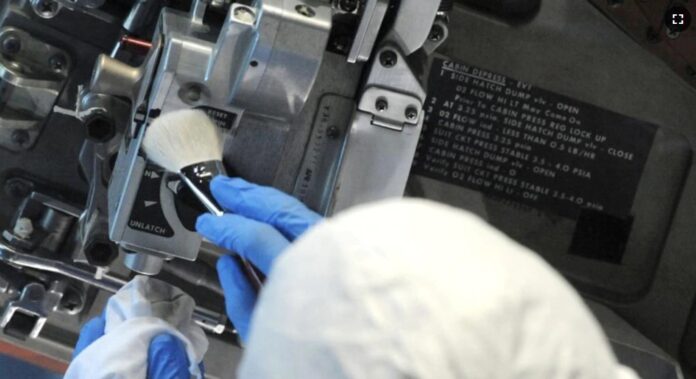 Vestido con ropa protectora, Stewart utilizaba un pincel para retirar polvo del lateral de la cápsula. El módulo, señaló, estaba en “bastante buena forma” para su edad y el tiempo que había pasado desde su limpieza anterior, hace unos tres años.