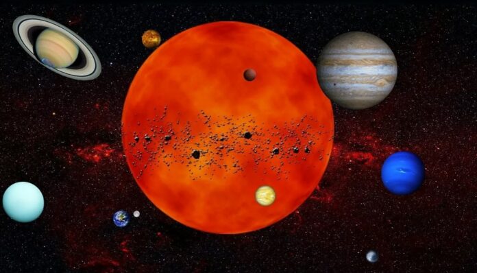 El colapso gravitacional hizo que los átomos de hidrógeno se fusionaran para formar gas de helio, liberando una enorme cantidad de energía, lo que dio origen al Sol. Las partículas restantes de la nebulosa solar comenzaron a atraerse, colisionar y fusionarse entre sí, convirtiéndose en planetas, lunas grandes y pequeñas, planetas enanos, asteroides, meteoritos y cometas.