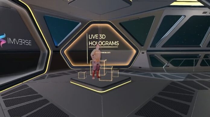 “Aquí ven un holograma tridimensional en vivo de mi persona integrado en un entorno artificial, en este caso una nave espacial”, dijo Javier Bello, presidente y fundador de Imverse, la compañía creadora de los emisarios holográficos. “Nuestro programa permite la captura simultánea de múltiples personas en distintas ubicaciones en tiempo real”.