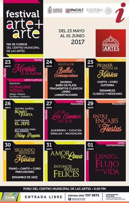 Ciudad Juárez, Chihuahua.- Los alumnos del Centro Municipal de las Artes presentarán su festival de fin de cursos denominado “arte+arte”, en el Foro del plantel, así lo informó Miguel Ángel Mendoza Rangel director del Instituto para la Cultura del Municipio (IPACUL).
