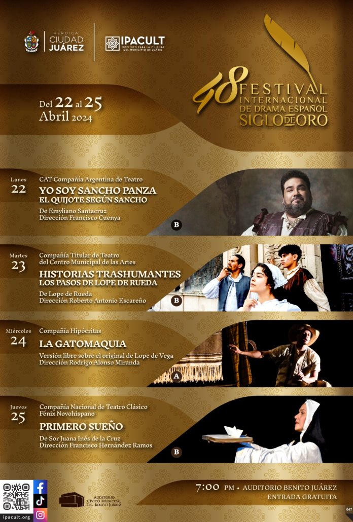 Ciudad Juárez, Chih .- El espectáculo teatral Festival de Drama Español Siglo de Oro, en su cuadragésima octava edición, se estará presentando de forma gratuita del 22 al 25 de abril en el Auditorio Cívico Benito Juárez. Todas las funciones serán a las 7:00 de la tarde.