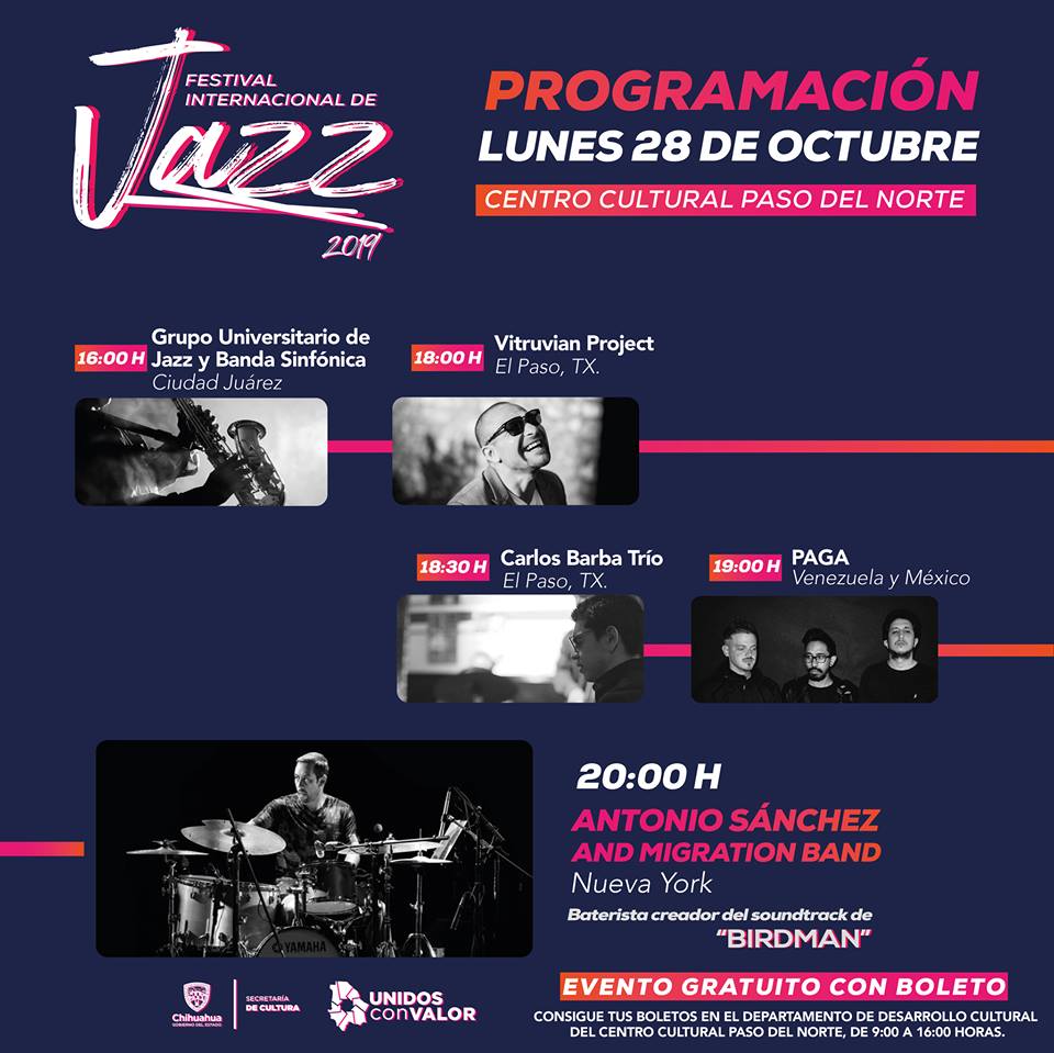 El lunes 28 de octubre, a partir de las 6 de la tarde, los conciertos continuarán en el Teatro Víctor Hugo Rascón Banda del CCPN con Vitruvian Project, Carlos Barba Trío, Paga y Antonio Sánchez, creador de la música de la película ganadora del Óscar “Birdman”, con la banda Migration Band.