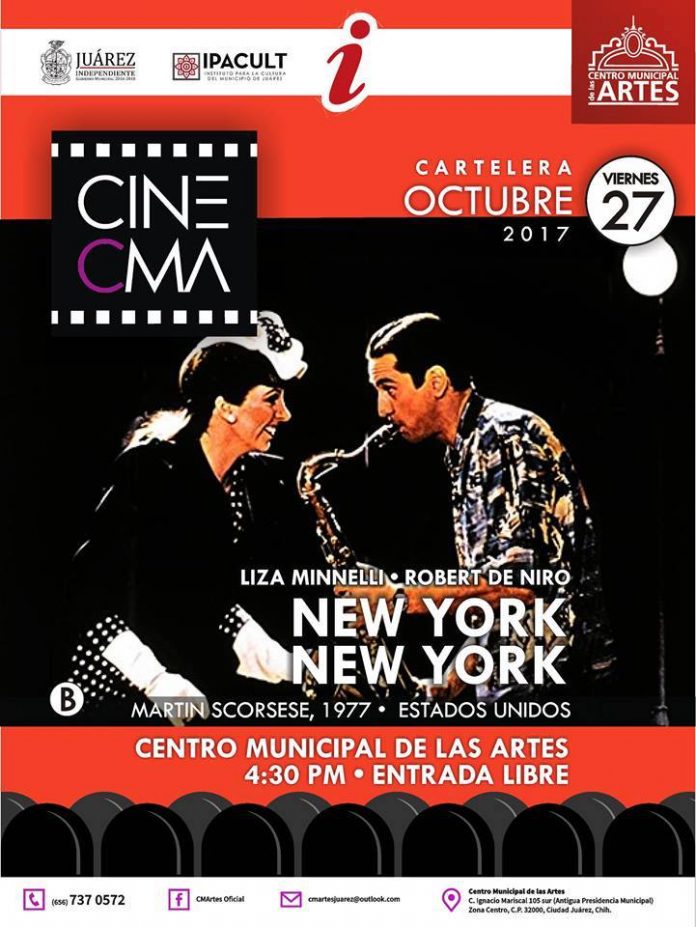 Ciudad Juárez, Chih. – Este viernes 27 de octubre a las 4:30 de la tarde se presentará el film “New York, New York” dentro del ciclo CineCMA, así lo informó Miguel Ángel Mendoza Rangel, director del Instituto para la Cultura del Municipio.
