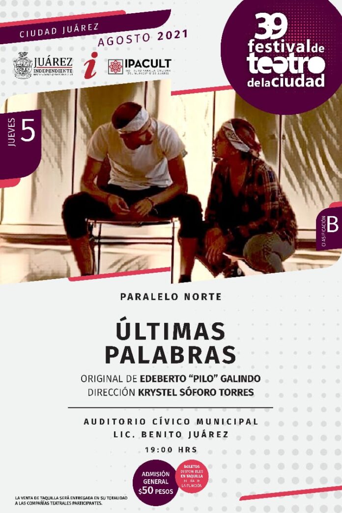 Ciudad Juárez, Chih. – En el quinto día de actividad del 39 Festival de Teatro de la Ciudad que se lleva a cabo en esta frontera bajo el auspicio del Instituto Para la Cultura del Municipio de Juárez (IPACULT), esta noche se presenta la obra “Últimas palabras”, de Edeberto “Pilo” Galindo, a cargo de la Compañía “Teatro Norte”.