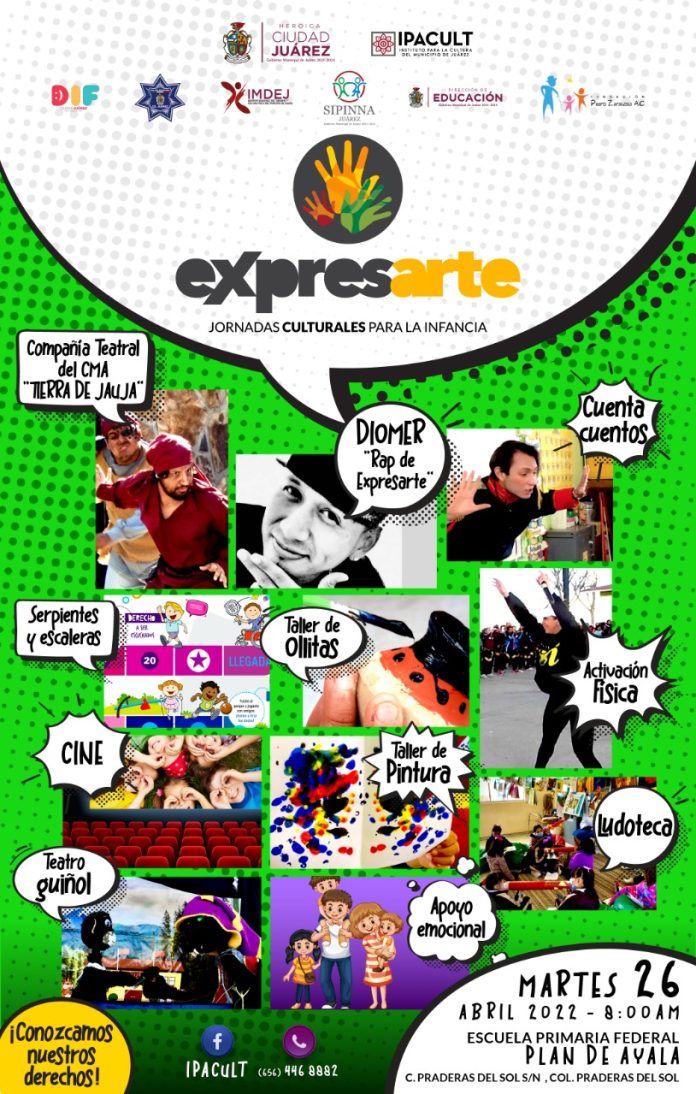 Ciudad Juárez, Chih .- A partir de las 8:00 de la mañana de ese día, los alumnos este plantel ubicado en calle Praderas del Sol sin número, en Praderas del Sol, inician con las dinámicas integradas en “ExpresArte”, a través de las cuales los infantes conocen de sus derechos participando en juegos lúdicos.