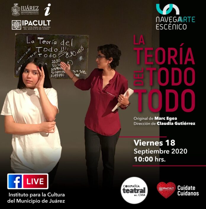 Ciudad Juárez, Chih. – El Instituto Para la Cultura del Municipio de Juárez (IPACULT) continúa este fin de semana con su programa de transmisiones de teatro en vivo a través del internet, con la representación de la obra “La Teoría del Todo”, de Marc Egea, con la Compañía de Teatro del Centro Municipal de las Artes (CMA).