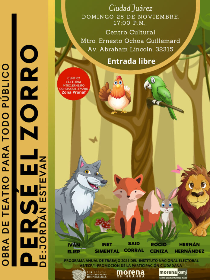 Ciudad Juárez, Chih. (ADN / Martín Orquiz) – Para promover la participación ciudadana en la vida política, el cuidado del medio ambiente y principios democráticos, el Comité Ejecutivo estatal de Morena invitó al público en general a la puesta gratuita de la obra de teatro Persé, el Zorro, del autor Jordán Esteban, el 28 de noviembre a las 17:00 horas.