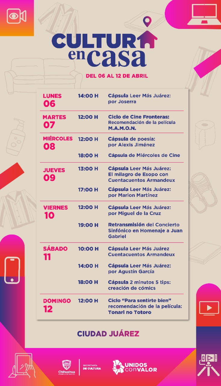 Ciudad Juárez, Chih. – El programa cultural a través de las redes sociodigitales de la Subsecretaría de Cultura Zona Norte y Cultura en Casa, prepararon una agenda semanal con actividades que literatura, cine y música, para mejorar la estancia de aislamiento durante la contingencia por COVID-19.