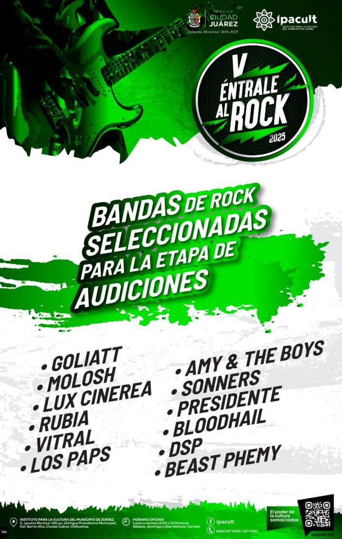 Ciudad Juárez, Chih. (ADN/Staff) – El Instituto para la Cultura del Municipio de Juárez (IPACULT) anunció este sábado 1 de noviembre a las 12 bandas seleccionadas que participarán en la quinta edición del concurso “Éntrale al Rock 2025”, certamen que tiene como objetivo impulsar el talento musical local y ofrecer un escenario profesional a las agrupaciones emergentes de la frontera.