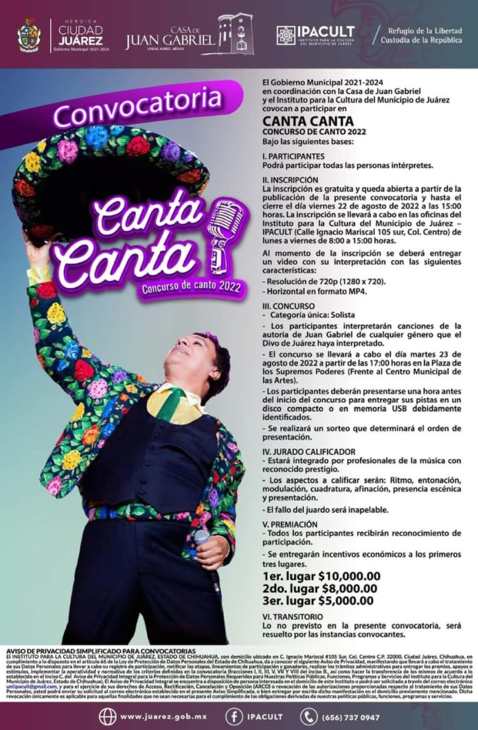Ciudad Juárez, Chih .- El Gobierno Municipal 2021-2024, a través del IPACULT y en coordinación con Casa de Juan Gabriel, invitan a la ciudadanía con gusto por la música del artista, a participar en el concurso “Canta Canta”, donde además de la experiencia de tomar parte en el evento, todos serán reconocidos por su participación y podrán ganar premios en efectivo los tres primeros lugares.