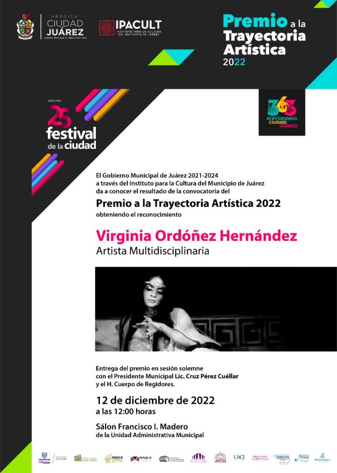 Ciudad Juárez, Chih .- El jurado calificador conformado por el Consejo de Gobierno del Instituto para la Cultura del Municipio de Juárez, eligió como ganadora a Virginia Ordóñez Hernández, quien obtendrá un estímulo económico de $50 mil pesos y una medalla conmemorativa.