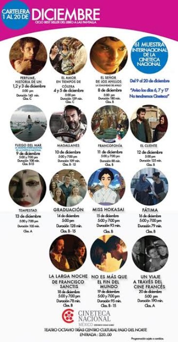 El ciclo forma parte la 61 Muestra Internacional de Cine, que oferta la Cineteca Nacional en Ciudad Juárez, con la que se promueve entre la ciudadanía el séptimo arte y el fomento a la lectura, ya que las películas se han consolidado como los “libros más vendidos” y sus adaptaciones a la pantalla grande, han gustado a público de todas las edades.