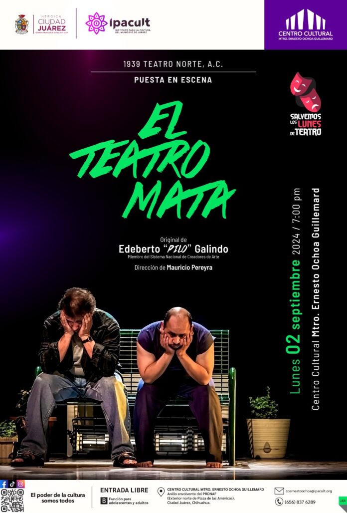 El Instituto para la Cultura del Municipio de Juárez (IPACULT) extiende una cordial invitación a la ciudadanía para disfrutar de la obra “El teatro mata”, que se presentará este lunes a las 7:00 de la tarde en el Centro Cultural “Ernesto Ochoa Guillemard”.