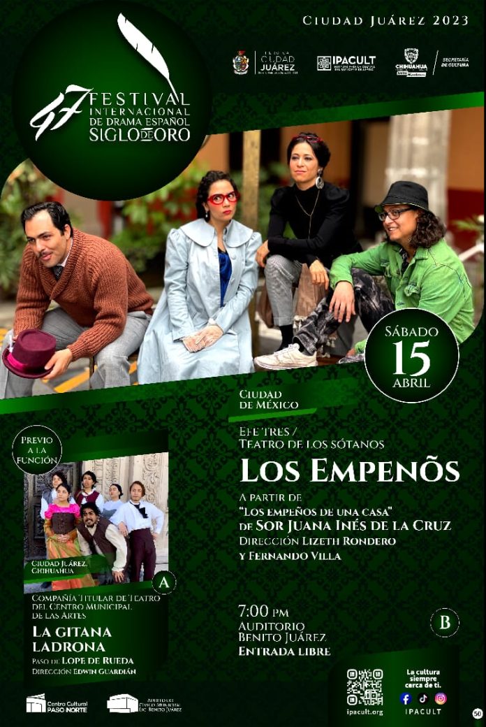 Ciudad Juárez, Chih .- Este sábado sigue su actividad con “Eje Tres” / Teatro de los Sótanos, quienes vienen de la Ciudad de México a presentar Los Empeños a partir de “Los empeños de una casa” de Sor Juana Inés de la Cruz, en el Auditorio Benito Juárez a las 7:00 de la tarde. Entrada gratuita.