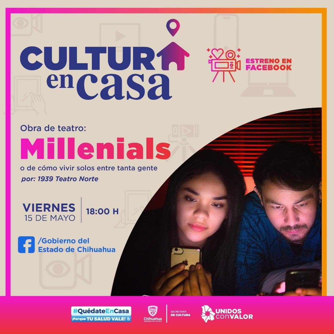 Chihuahua, Chih. – La Subsecretaría de Cultura Zona Norte, a través del programa #CulturaEnCasa de la Secretaría de Cultura de Chihuahua, presenta el estreno en Facebook de la obra de teatro “Millenials, o de cómo vivir solos entre tanta gente”, el próximo 15 de mayo, en punto de las 18:00 horas, en la página de Gobierno del Estado de Chihuahua en www.facebook.com/gobiernochihuahua.