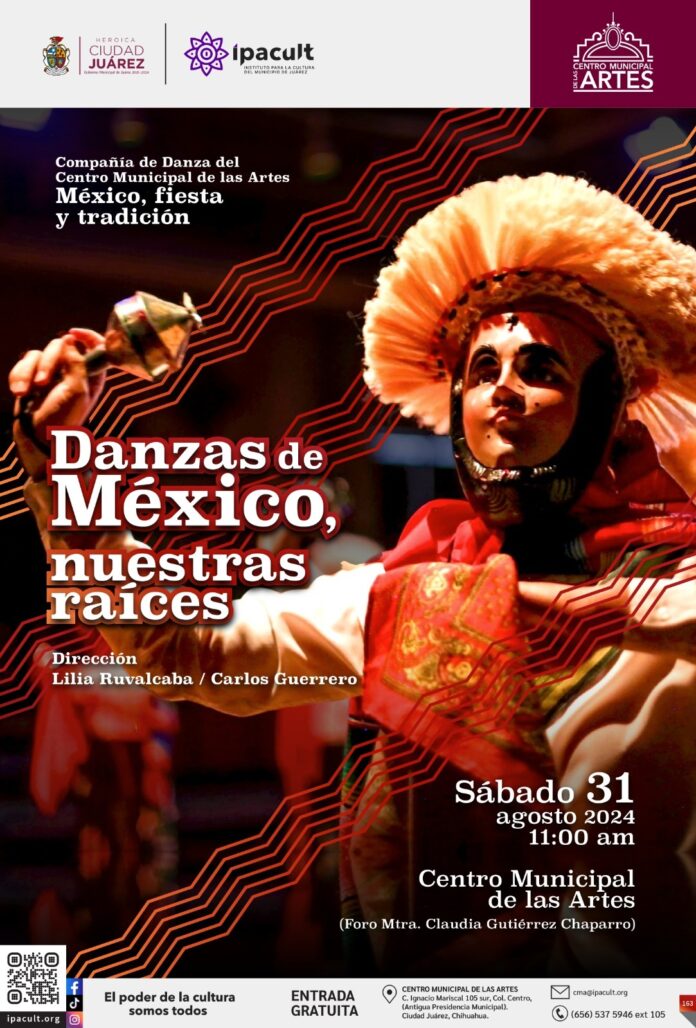 El Instituto para la Cultura del Municipio de Juárez (IPACULT) extiende una cordial invitación a la ciudadanía para disfrutar del evento cultural “Danzas de México, Nuestras Raíces”, que tendrá lugar este sábado a las 11:00 de la mañana en el foro “Claudia Gutiérrez” del Centro Municipal de las Artes (CMA).