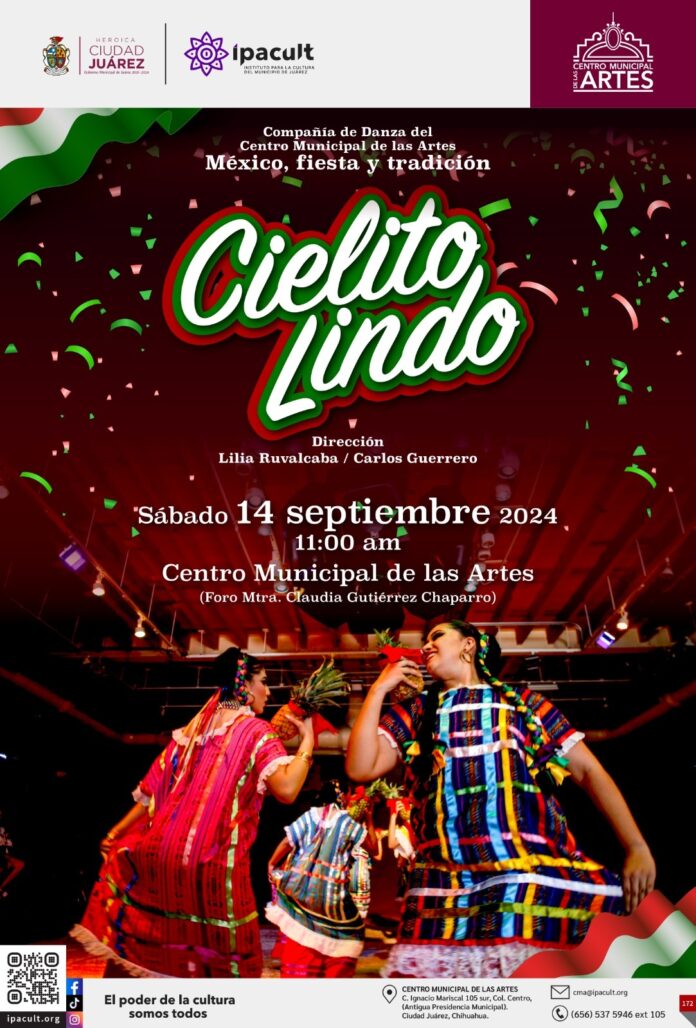 El Instituto para la Cultura del Municipio de Juárez (IPACULT) invita a la ciudadanía a disfrutar del espectáculo “Cielito Lindo”, que se presentará este sábado 14 de septiembre a las 11:00 de la mañana en el foro “Claudia Gutiérrez” del Centro Municipal de las Artes (CMA).