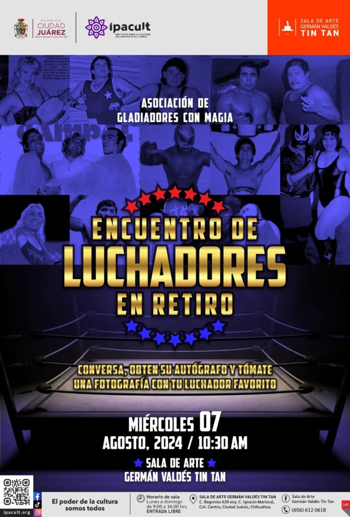 El Instituto para la Cultura del Municipio de Juárez (IPACULT) extiende una cordial invitación a toda la ciudadanía para asistir al encuentro de “Luchadores en Retiro” organizado en coordinación con la asociación Gladiadores con Magia y que se llevará a cabo este miércoles a las 10:30 de la mañana en la Sala de Arte Germán Valdés “Tin Tan”.
