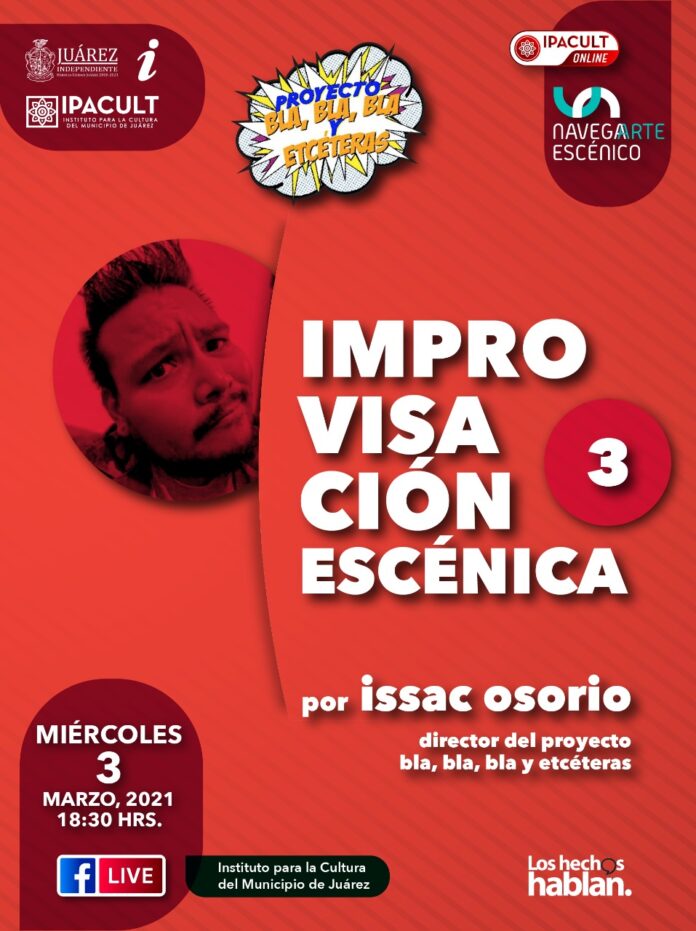 Ciudad Juárez, Chih.- El Instituto Para la Cultura del Municipio de Juárez (IPACULT) invita a los interesados en el aprendizaje del arte escénico a sintonizar esta tarde el tercer tutorial de técnicas de actuación, actividad online impartida por el actor y director del proyecto “Bla, Bla, y Etcéteras” de la CDMX, Ernesto Isaac Osorio Hernández.