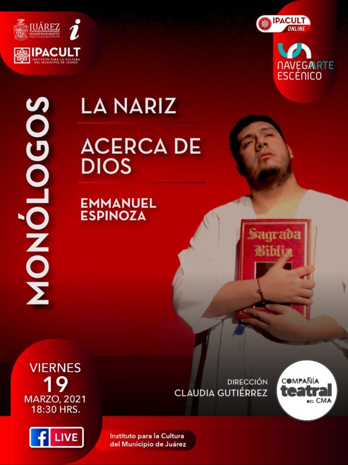 A las 6:30 de la tarde de este viernes será la transmisión de los monólogos “La nariz” y “Acerca de Dios”, el primero de autor anónimo y el segundo original de Emanuel Espinoza, actor que estará a cargo de ambas representaciones.