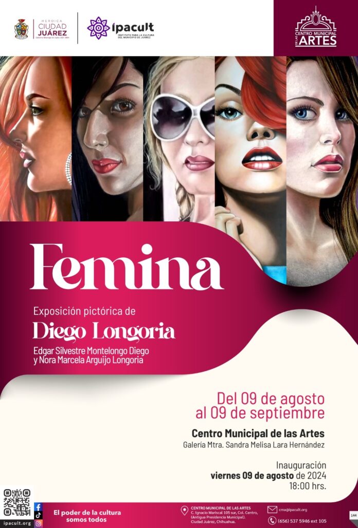 El Instituto para la Cultura del Municipio de Juárez (IPACULT) invita a la ciudadanía a disfrutar de la exposición pictórica “Fémina” de la artista Nora Marcela Arguijo Longoria, en honor a Edgar Silvestre Montelongo Diego, la cual se exhibirá en la galería “Melisa Lara Hernández” del Centro Municipal de las Artes (CMA).