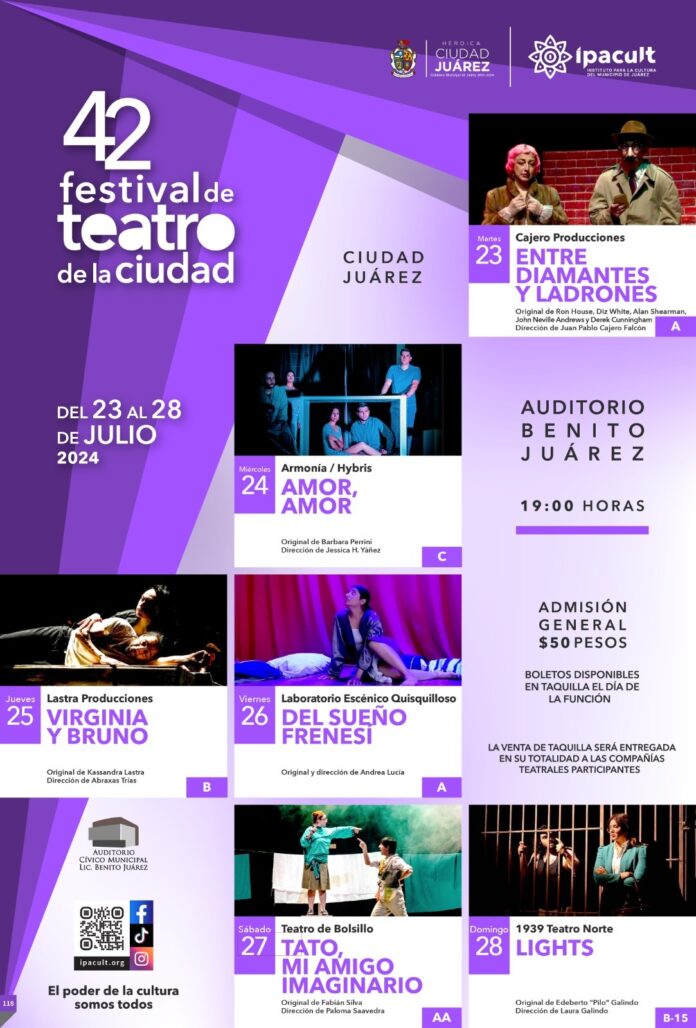 El Gobierno Municipal de Juárez, a través del Instituto para la Cultura del Municipio (IPACULT), invita a la ciudadanía a la cuadragésima segunda edición del Festival de Teatro de la Ciudad.