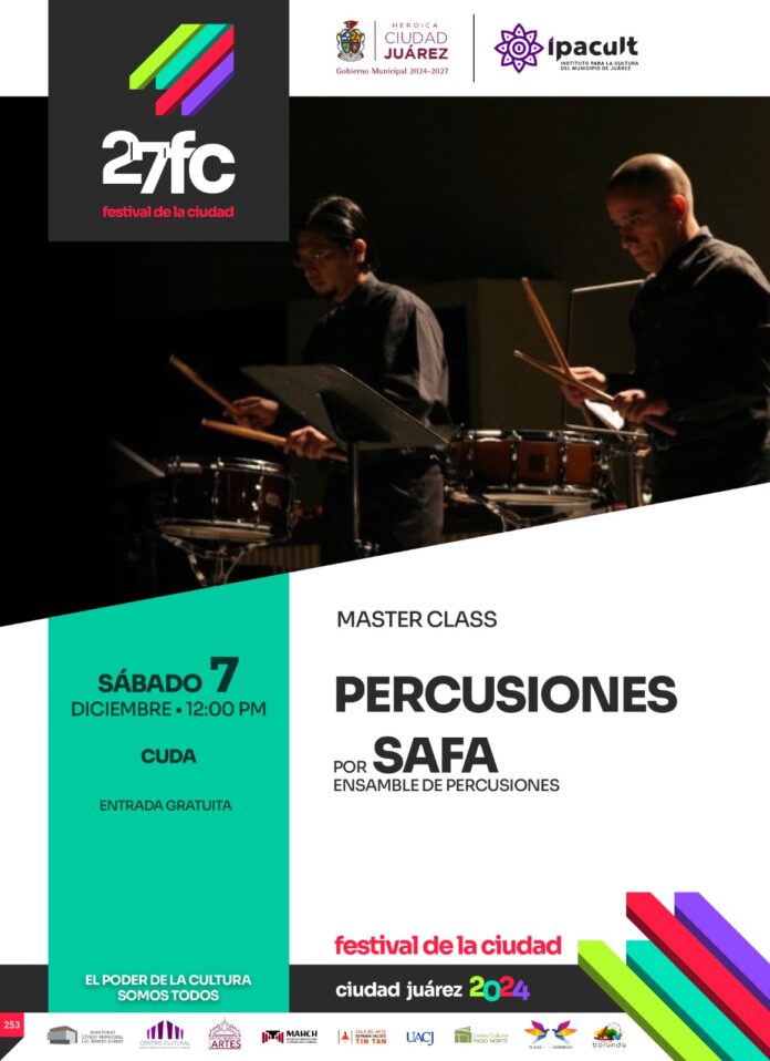El Festival de la Ciudad, organizado por el Instituto para la Cultura del Municipio de Juárez (IPACULT), incluirá entre sus actividades una master class de percusiones a las 12:00 del mediodía en el Centro Universitario de las Artes (CUDA) de la Universidad Autónoma de Ciudad Juárez (UACJ).