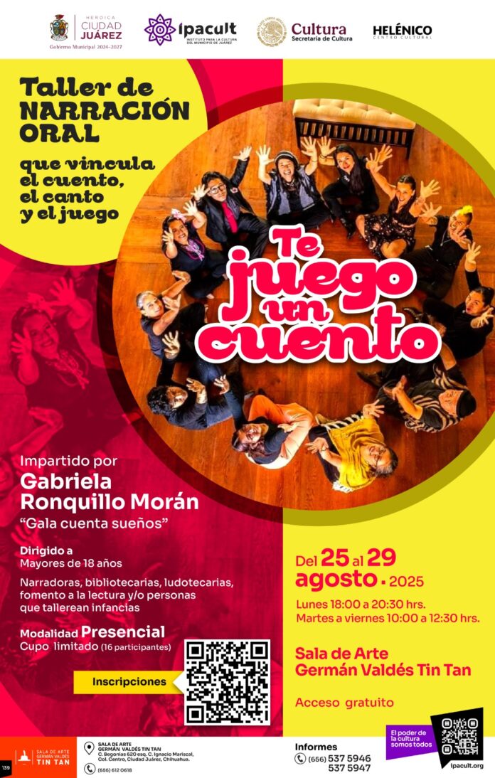 El Instituto para la Cultura del Municipio de Juárez (IPACULT) hace una invitación a la comunidad interesada en la narración y la promoción de la lectura para participar en los talleres gratuitos “Te juego un cuento”, que serán impartidos por la narradora oral escénica Gabriela Ronquillo Morán, del 25 al 29 de agosto en la Sala de Arte Germán Valdés “Tin Tan”.