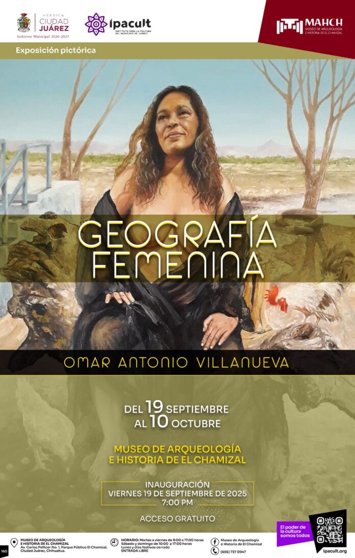 El Instituto para la Cultura del Municipio de Juárez (IPACULT) invita a la comunidad fronteriza a la inauguración de la exposición pictórica “Geografía Femenina” del artista Omar Antonio Villanueva, que se llevará a cabo este viernes 19 de septiembre a las 7:00 de la tarde en el Museo de Arqueología e Historia de El Chamizal (MAHCH).