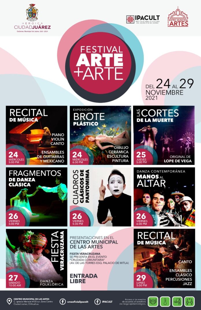 Ciudad Juárez, Chih .- Todo listo para que la tarde de este miércoles inicien las actividades del tradicional Festival Arte +Arte que el Instituto Para la Cultura del Municipio de Juárez (IPACULT) y el Centro Municipal de las Artes (CMA) ofrecen al público con motivo del cierre de semestre.